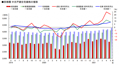 実際に、首都圏の中古戸建ての価格は、ここ数ヶ月、昨年と比較して1.2倍前後で推移しています。成約数も、昨月は5月として過去最高値を記録。ウッドショックにより、コロナ禍での中古戸建て人気がさらに加速しそうです。