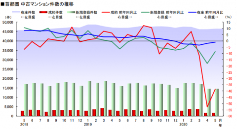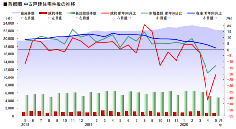 上記は中古マンション、下記は中古戸建の首都圏の流通数の推移を表したものです。赤線が成約件数の推移ですが、いずれも2020年5月の成約数は、前年同月比にして-20~40%。ただ、4月と比較すると5月は回復傾向にあるといえます。