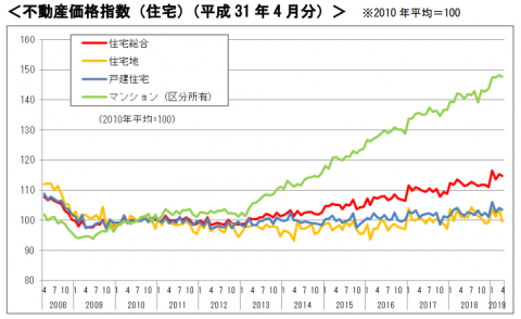 上記グラフは、国土交通省が発表している「不動産価格指数」の推移を表したものです。不動産価格指数とは、基準となる水準からどれくらい不動産価格は高騰・下落しているかを数値化して表したもの。上記は2010年の平均値を100としています。
