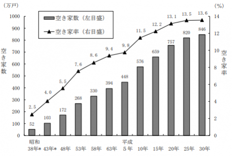 全住宅数に対する空き家数の比率を示した数値を、「空き家率」といいます。日本の空き家率は年々上昇していますが、昨年の調査では13.6%と過去最高になりました。日本中にある住宅の7軒に1軒は、人が住まない空き家だということです。空き家問題は、空き家率の高さだけが問題ではありません。管理不行き届きの空き家の増加や、マンション空き家の増加により管理に支障をきたすマンションの増加などもまた、大きな問題となっています。