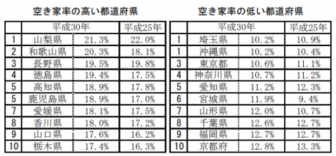 空き家率が最も高いのは、21.3%の山梨県。甲信、四国地方は、全体的に空き家率が高い傾向にあります。一方、空き家率が最も低いのは、10.2%の埼玉県。山梨県の半分以下の空き家率です。次いで沖縄、東京、神奈川となっており、これらの地域は5年前の調査と比べて空き家率が低くなっているのも特徴です。
