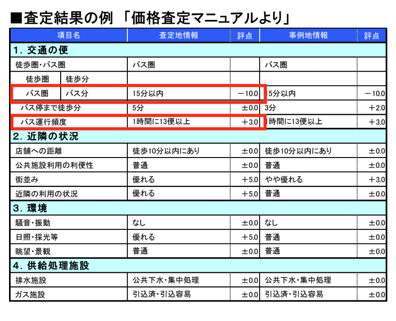 駅までバスを利用しなければならないとなると、徒歩圏内の不動産より評点は下がります。そしてお察しのとおり、バスの乗車時間が長ければ長いほど、運行頻度が低ければ低いほど評点は下がります。