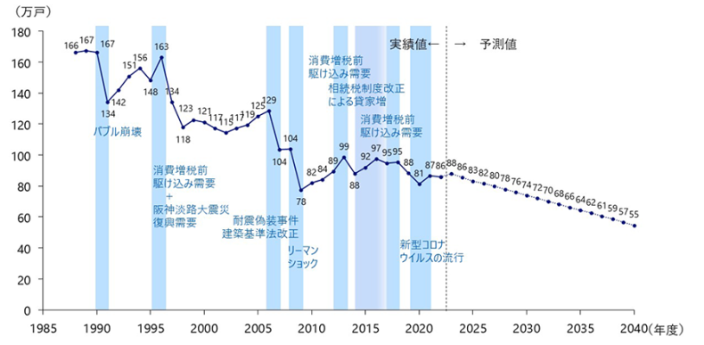 新築住宅の着工数は年々数を減らしており、この約20年でほぼ半減しています。野村総合研究所の予測によれば、新築住宅の着工数は今後もどんどん減っていくということです。