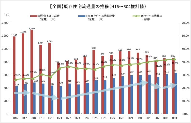 新築住宅の数が減り、価格が著しく高騰する中、中古住宅(既存住宅)の流通比率は年々高まっています。2022年の既存住宅流通比率は42.3%と過去最高に達し、半数に迫っています。