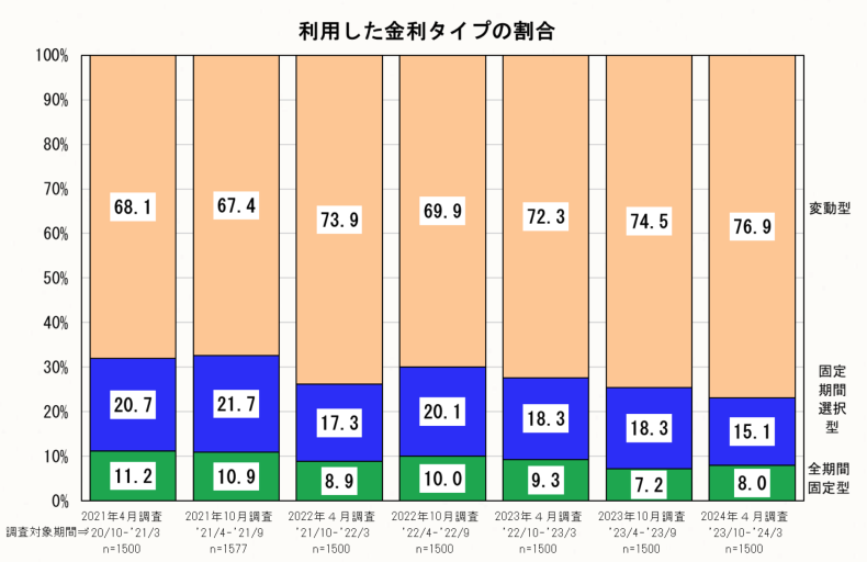 上記のグラフのように、変動金利を利用する人の割合は上昇傾向にあります。その理由は、固定金利との金利差です。直近のデータでは、変動金利を利用する人は76.9%と8割近くにのぼります。
