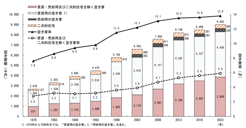 2024年には最新の空き家数・空き家率が公表されましたが、いずれも過去最高を更新しました。日本の住宅は現在、7軒に1軒程度が空き家です。